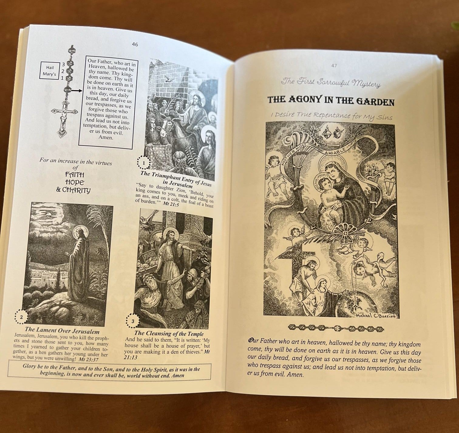 - Artistic Journey: Enjoy exquisite original artwork by Michael C. Buccino, created over a period of 24 years, that accompany each bead of each mystery.