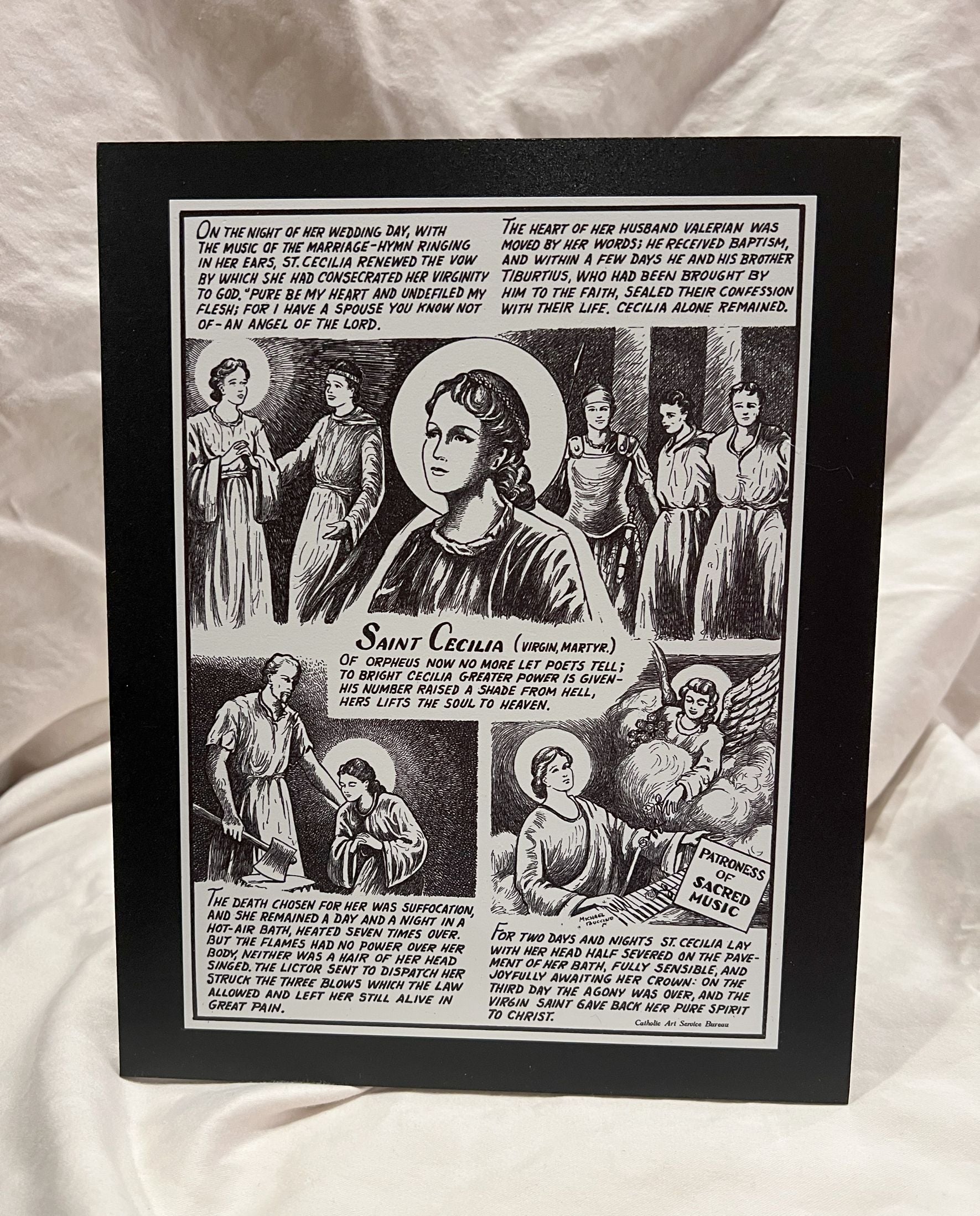 This 8X10 desktop plaque showcases the inspiring story of Saint Cecilia as published in the Lives of the Saints Collection book. Made from durable plastic, it features an easel back for desktop display. Perfect as a gift or keepsake, especially for Confirmation candidates. Limited availability—once sold out, these plaques won't be restocked!