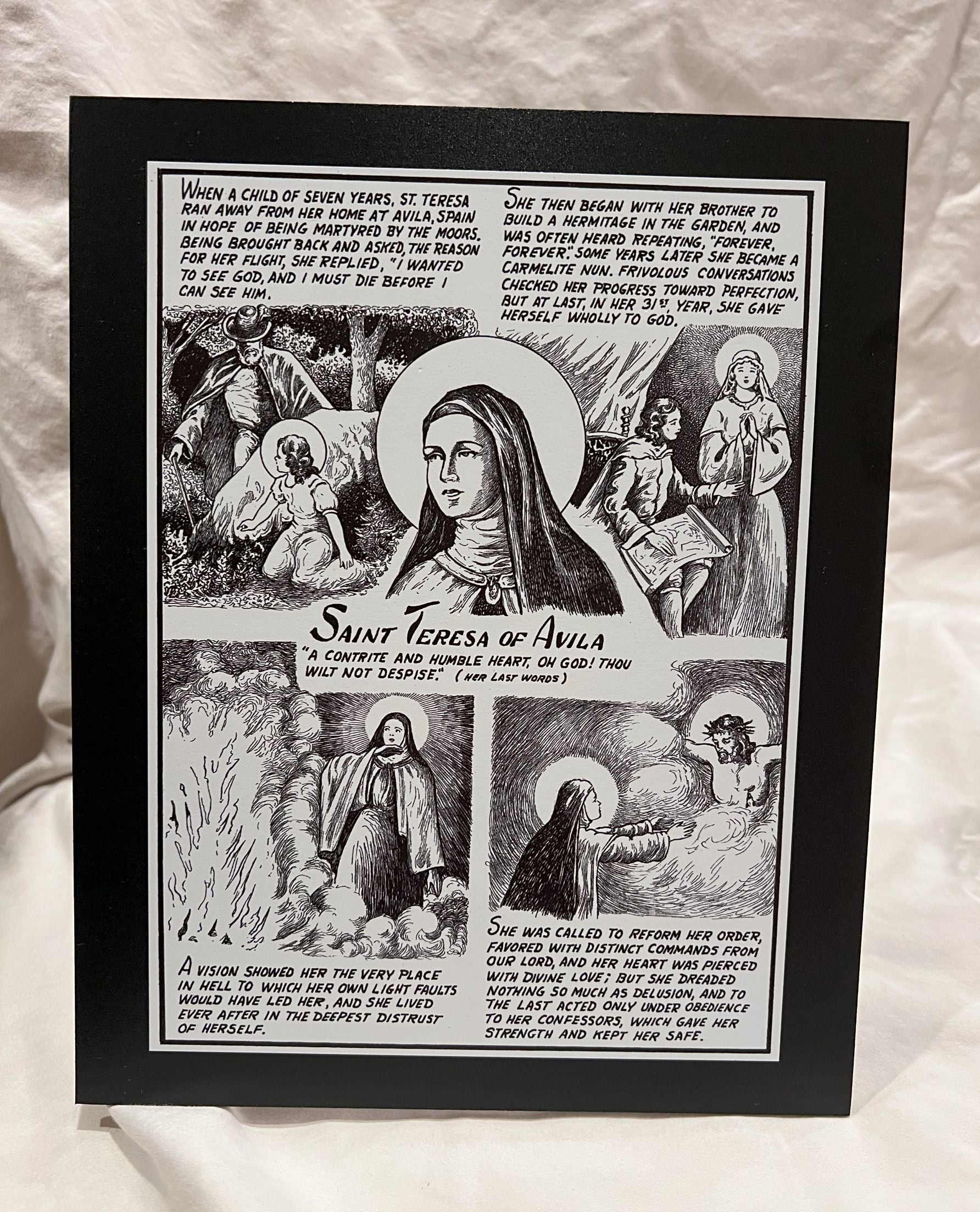 This 8X10 desktop plaque showcases the inspiring story of Saint Teresa of Avila as published in the Lives of the Saints Collection book. Made from durable plastic, it features an easel back for desktop display. Perfect as a gift or keepsake, especially for Confirmation candidates. Limited availability—once sold out, these plaques won't be restocked!