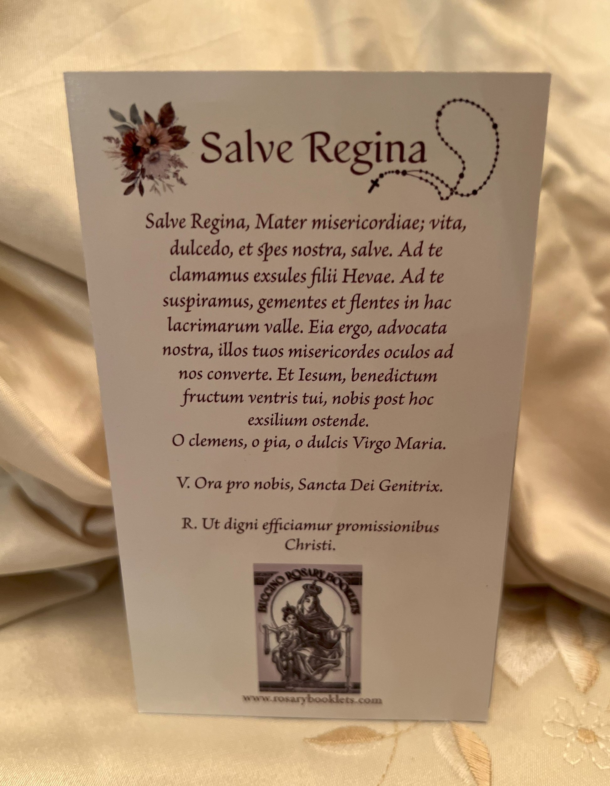 - Prayer: Includes the Salve Regina {Hail Holy Queen in Latin) prayer on the reverse side